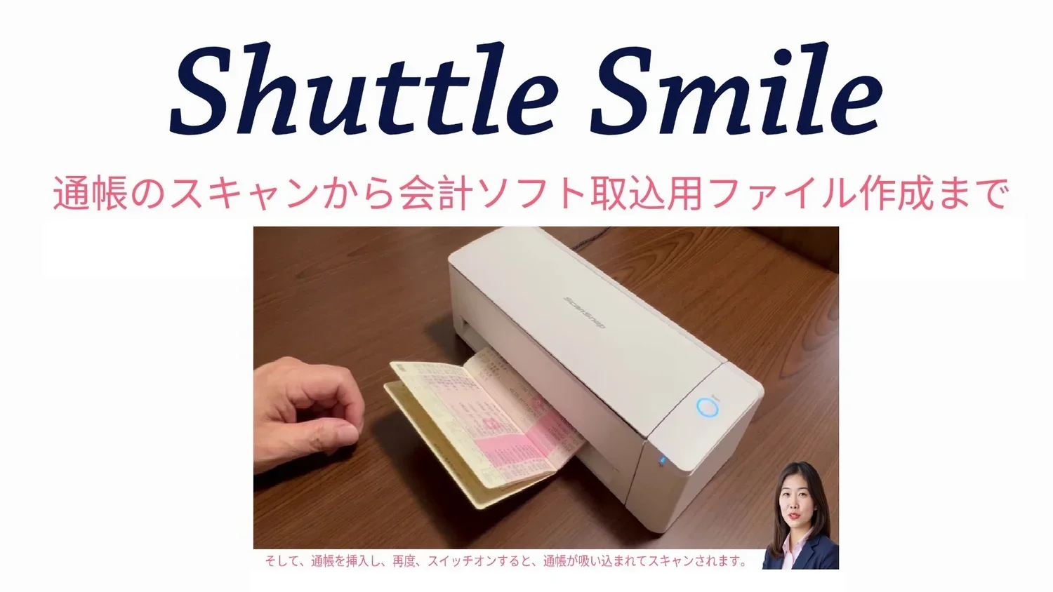 こちらをクリックするか、以下の画像をクリックすると、実際に通帳をScan Snap iX1300でスキャンした後、Shuttle Smileで会計ソフト取込用CSVファイルに変換するまでの動画を視聴できます。