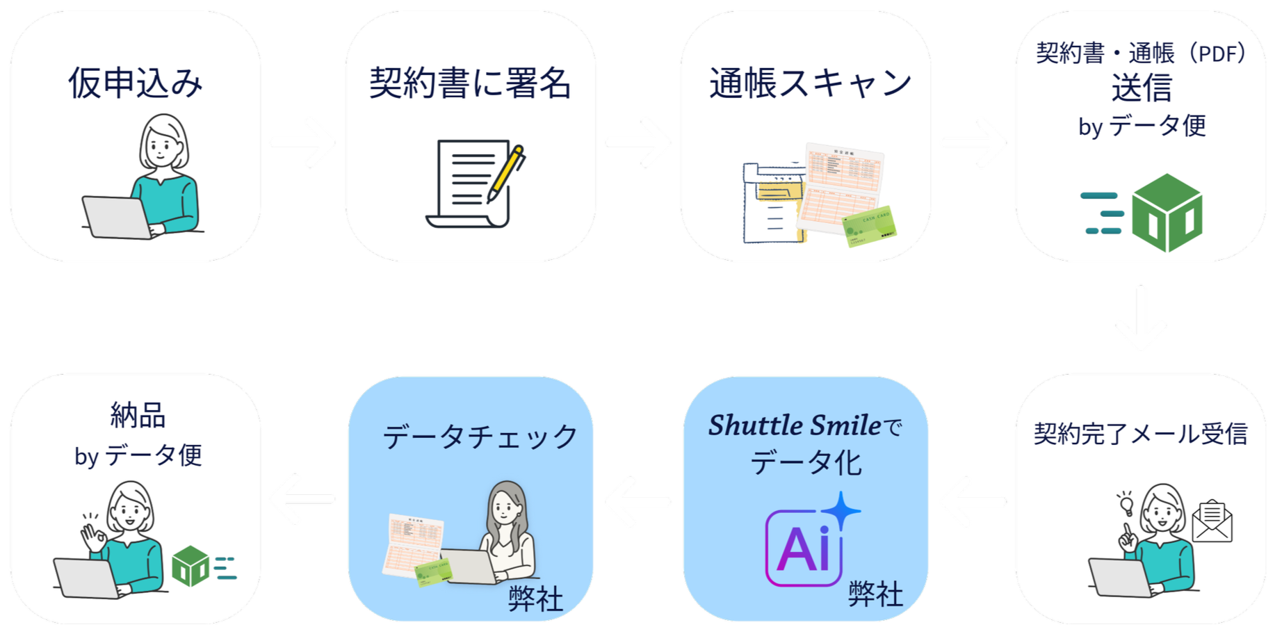 仮お申し込み後、1営業日以内に「通帳のデータ作成に関する委受託契約書」(PDF)を「データ便」にてお客様に送信しますので、内容をご確認・署名後、データ便にて返送お願いします。(契約書送信時にデータ便によるアップロード用URLもお知らせします)
